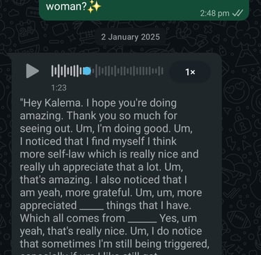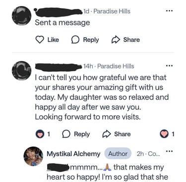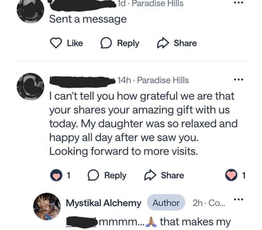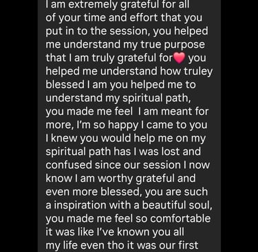 I went into this experience with no expectations, no specific want or need. Although a little nervous, I was open to every opportunity that came to this life energy. When I arrived, I found my sanctuary. It was humbling, comfortable, and I felt more at home than in my actual house. Our conversation began as an everyday chat, in which I found myself opening up about life and the experiences I've had. Love was flowing all around this safe place as my ceremony began. The discoveries and connections I made have brought peace and understanding to what I have been holding onto since I was very young. I will forever cherish this experience and truly feel it opened and saved my life from harming myself. I've been inspired to meditate, actually breathe, and communicate within. I look forward to my next journey with Kahleema.