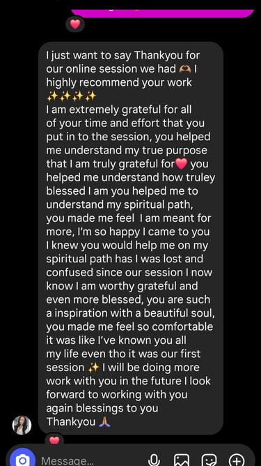 Thank you so much to Kahleema & John! A friend recommended them to help me with an energy clearing and healing session, and I am so glad I tried it out. I feel like a weight has been lifted from me, and I can breathe easier. I was finally able to let go of some negative emotions and thoughts that I was holding on to. I can enjoy cooking again and appreciate the taste of the food, which is something that I had lost. I feel like I have my power back. Highly Recommend!